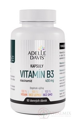 Doplněk stravy s obsahem vitaminu B3 (nikotinamidu) ve formě kapslí. Vitamin B3:< p>