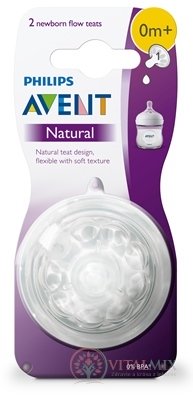 Silikonové dudlíky AVENT Natural umožňují sání stejnou technikou jako při kojení, snižují riziko vzniku novorozenecké koliky a nadýmání. Kontrolujte dudlík vždy před i po každém použití. Poškozený, proděravěný nebo opotřebovaný dudlík (např. od zoubků) ihned vyměňte. Dudlík na lahvičkách nepoužívejte jako dudlík na uklidnění. Novorozenecký průtok, extra měkká silikonová savička 0m+. Pro novorozence a kojené děti.