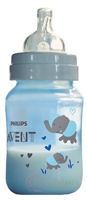 Kojenecká láhev Antikolik s měkkým dudlíkem, pomalým průtokem (dva otvory v dudlíku). Láhev je vyrobena z polypropylénu (PP), který jemodrej barvy s obrázkem slona.
