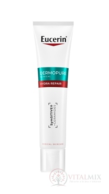 "Eucerin DermoPure CLINICAL Obnovující krém je intenzivně hydratační krém vhodný ke zklidnění podrážděné pleti a zmírnění vedlejších, silně vysušujících účinků léčby akné. Obsahuje unikátní kombinaci uklidňujícího Symsitive¹ a ceramidů, které podporují ochrannou bariéru pleti a snižují ztrátu.