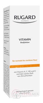 Rugard Vitamínové tělové mléko představuje ideální vitamínovou a hydratační péči. Jemně posiluje strukturu pokožky a intenzivně ji ošetřuje po dlouhou dobu. Pro jemnou a hebkou pokožku. Vitamin E podporuje schopnost pokožky vázat vlhkost a působí antioxidačně. Vitamin B3 zmenšuje ztrátu vlhkosti a urychluje obnovu buněk. Bambucké (shea) máslo a avokádový olej intenzivně pečují o pokožku.