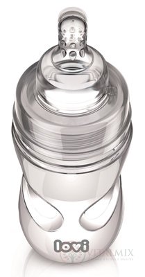 Set obsahuje lahvičku Lovi objemu 250ml, silikonový dynamický dudlík mini 3m +, měkký těsnící disk, šroubovací víčko, víčko s odměrkou.