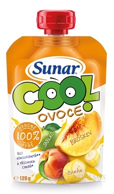 Sunar Cool ovoce broskev, banán, jablko. Ovocný příkrm, mix 3 druhů 100% ovocného pyré, pro děti od ukončeného 12. měsíce věku. Pasterizované. Skvěle zasytí a doplní vitamíny. Neobsahuje přidaný cukr.