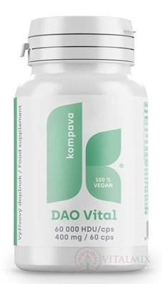DAO Vital je produkt na podporu odbourávání histaminu. DAO je enzym zodpovědný za metabolizaci histaminu, biologicky aktivní sloučeniny zapojené do různých fyziologických procesů. Vitamin B6 je důležitý pro metabolismus histaminu, protože může pomoci DAO při rozkladu histaminu. Vitamin C má antioxidační účinky a může snížit uvolňování histaminu.