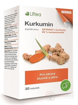 Výživový doplněk s obsahem extraktu z kořene kurkumy 157 mg a inulinu 300 mg.