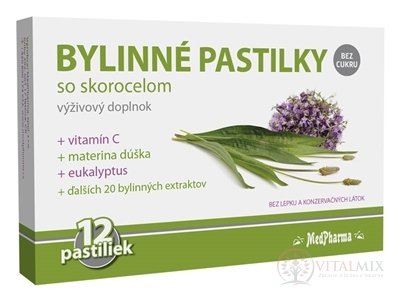 Doplněk stravy, bylinné pastilky se sladidly. Bez lepku a konzervačních látek. Obsahuje více než 20 extraktovz bylin např. jitrocel, mateřídouška, eukalyptus. Vitamín C podporuje správnou funkci imunitního systému.