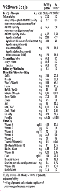 2Používejte pouze k balení přiloženou odměrku. Nedávejte více nebo méně prášku, než udává tabulka, jinak může dojít k dehydrataci, nebo podvýživě dítěte. Neměňte poměr prášku a vody bez porady s lékařem!