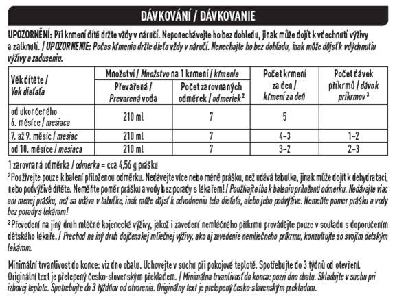 UPOZORNĚNÍ: Připravujte vždy jen jedinou dávku a krmte ihned po přípravě. Neuchovávejte nedojedené porce. Dodržujte přesně návod na přípravu, jinak ohrozíte zdraví kojence.