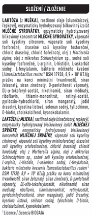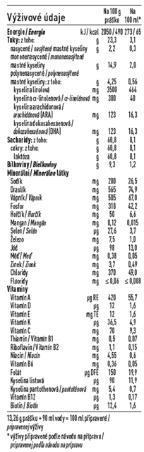 LAKTÓZA (z MLÉKA), rostlinné oleje (slunečnicový, řepkový), enzymaticky hydrolyzovaný bílkovinný izolát MLÉČNÉ SYROVÁTKY, enzymaticky hydrolyzovaný bílkovinný koncentrát MLÉČNÉ SYROVÁTKY, vápenaté soli kyseliny citronové, vápenaté soli kyseliny fosforečné, draselné soli kyseliny fosforečné, chlorid draselný, chlorid hořečnatý, olej z Mortierella alpina, olej z mikrořas Schizochytrium sp., sodné soli kyseliny fosforečné, L-arginin, L-histidin, L-askorbát sodný, L-fenylalanin, bakterie mléčného kvašení (Limosilactobacillus reuteri¹ DSM 17938; 8,9 × KTJ/g prášku na konci minimální trvanlivosti), síran železnatý, síran zinečnatý, D-pantothenát vápenatý, DL-α-tokoferyl-acetát, nikotinamid, síran měďnatý, riboflavin, thiamin-mononitrát, retinyl-acetát, pyridoxin-hydrochlorid, síran manganatý, jodid draselný, kyselina listová, selenan sodný, fyllochinon, D-biotin, cholekalciferol, kyanokobalamin.