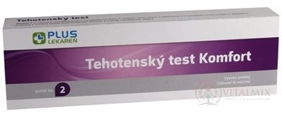 PLUS LÉKÁRNA Těhotenský test Komfort 10 mIU/ml: Jednorázový HCG těhotenský test na samotestování (IVD): testovací tyčinka přímo do proudu moči. Testovací sada obsahuje: 2 sáčky - v každém 1. testovací tyčinka, suchý přípravek a 1 návod k použití.