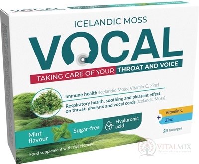 Doplněk stravy se sladidly, islandským lišejníkem, vitamínem C, zinkem a kyselinou hyaluronovou. Vocal HA obsahuje kombinaci islandského lišejníku, vitamínu C, kyseliny hyaluronové a zinku. Islandský lišejník (Cetraria islandica) má příznivé účinky na hrdlo a hlasivky. Podporuje zdraví sliznice úst a hrdla. Vitamin C a zinek přispívají ke správnému fungování imunitního systému ak ochraně buněk před oxidačním stresem. Zinek hraje roli v procesu dělení buněk.