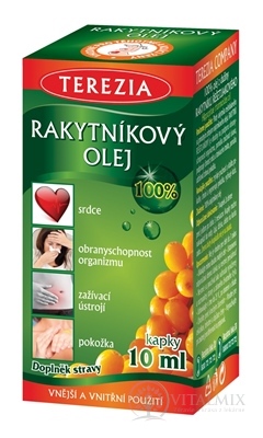 Doplněk stravy, rakytníkový olej je přírodní koncentrát vitaminů A, B1, B2, B6, D, E, F, K, P, dále obsahuje betakaroten, kyselinu listovou, organické kyseliny, třísloviny a minerální soli, důležité esenciální mastné kyseliny omega-3, -6, -9