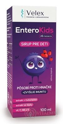 Sirup na přírodní bázi obsahující extrakty z šipek a borůvky; vitamíny C, B6 a K.