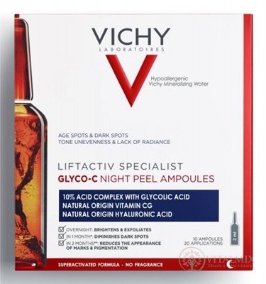 Ampule proti pigmentaci představují inovaci od Vichy s vysoce koncentrovanou silou aktivních látek používaných v dermatologii, vybraných pro účinnou korekci hlavních známek stárnutí pleti. Cíli na pigmentové skvrny, nejednotný odstín a nedostatečný jas pleti. Přes noc pomáhají k rozjasnění pleti a její exfoliaci.
