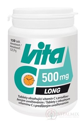 Vita C 500 mg Long je tableta vitamínu C s postupným uvolňováním, která se ve střevě z tablety postupně uvolňuje (8-9 hodin) a tak zaručuje lepší absorpci a jeho biologickou dostupnost po celý den.